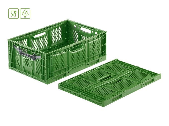 die Klappbehälter der Serie Clever-Fresh-Box advance wurden speziell für die Anforderungen in der Frischelogistik entwickelt. Klappt man die leeren Boxen zusammen, reduziert sich das Volumen der Behälter um rund 84 %. Dadurch sind die Klappbehälter beim Rücktransport sehr platz- und kostensparend. Damit das Obst und Gemüse beim Transport nicht beschädigt wird, sind die perforierten Seitenwände des Klappbehälters besonders glatt und ohne scharfe Kanten.